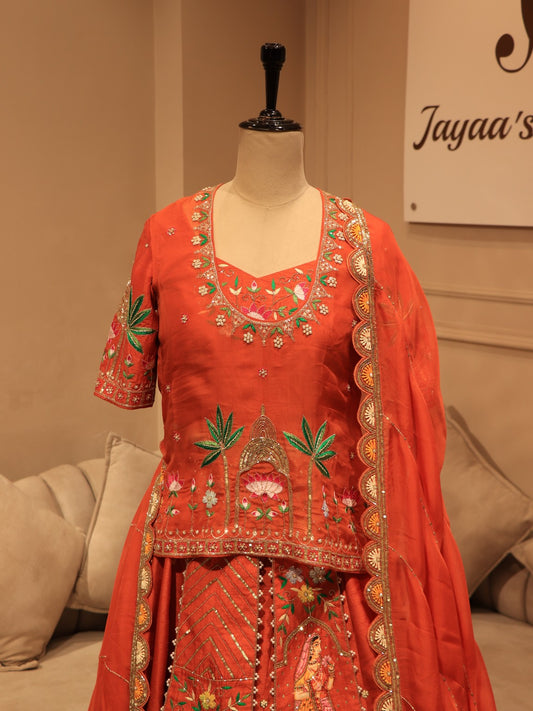 Rust orange hand painted lehenga set