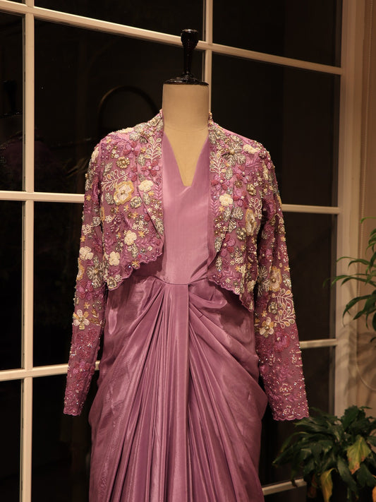 lavender drape gown with shrug
