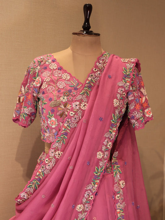 Pink tissue embroidered lehenga set