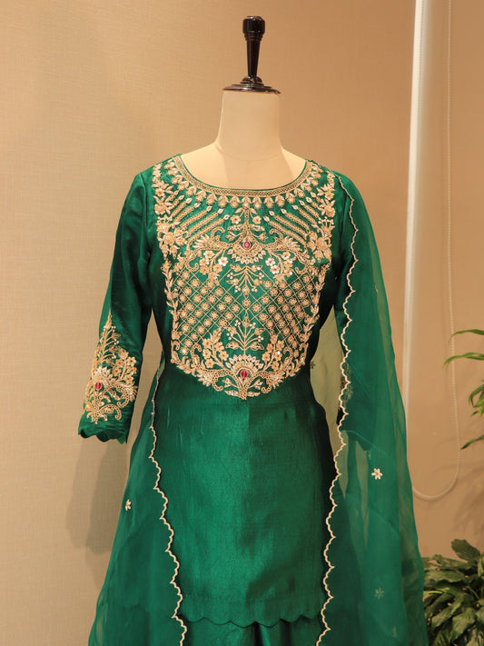 Bottle green embroidered kurta plazo dupatta