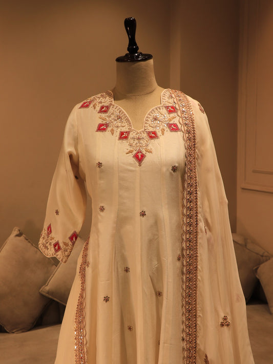 Off white anarkali gown with plazo and dupatta