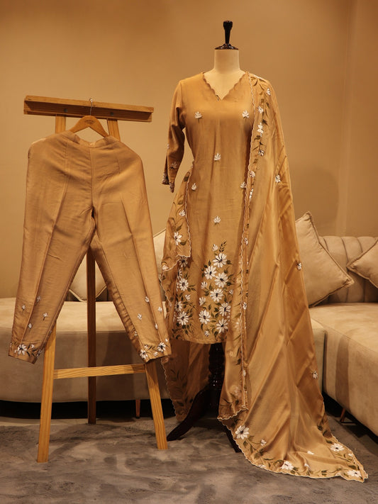 Beige handpainted kurta pants dupatta