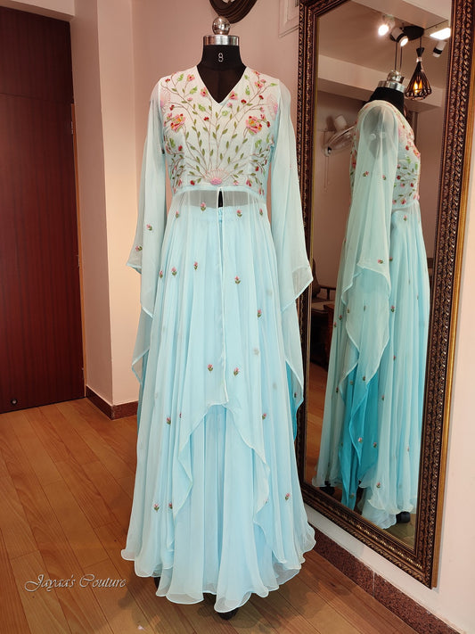 Pastel sea green hand painted cape with crop top and skirt