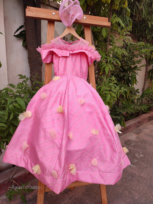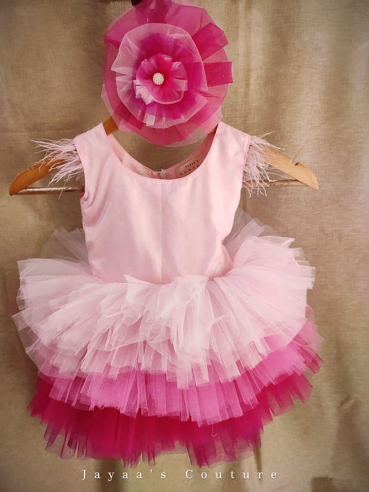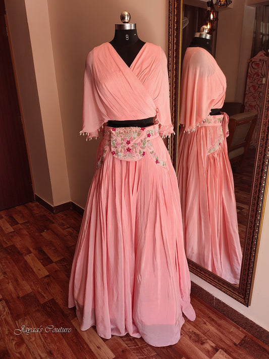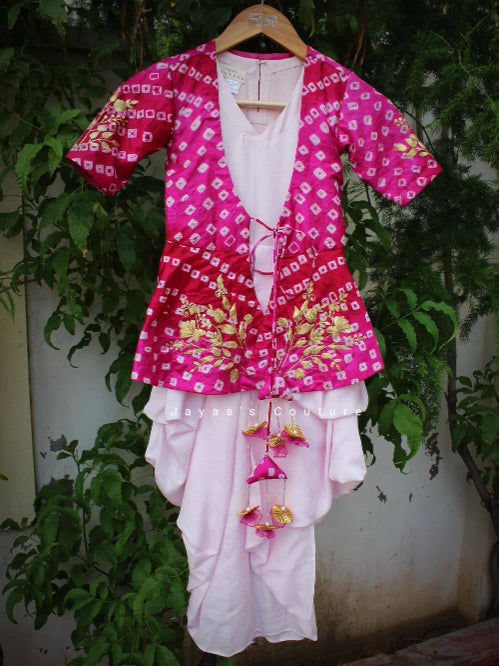 Pink dhoti draped dress with bandhani peplum style jacket.