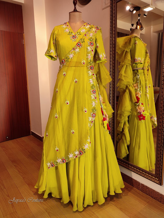 Greenish yellow skirt & blouse with drape dupatta