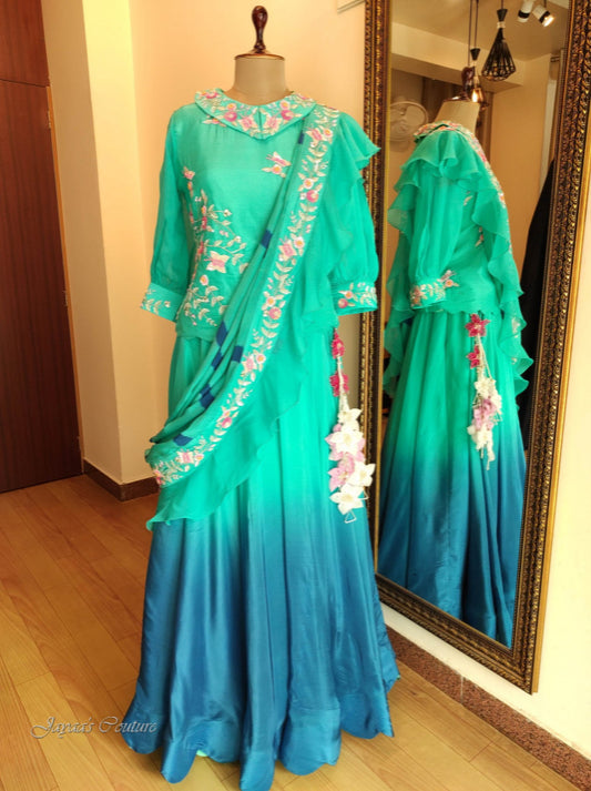 Greenish blue ombre skirt with top & drape dupatta