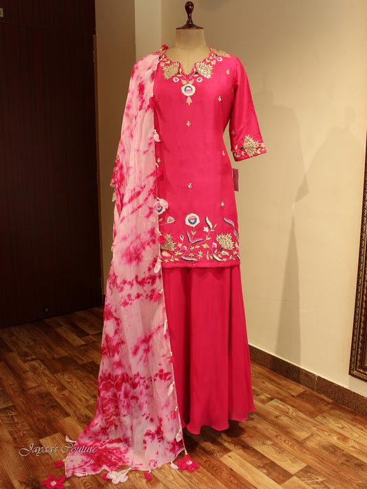 Pink kurta with tie and dye skirt with dupatta