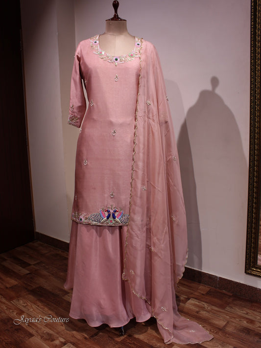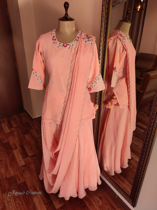 Peach kurta with skirt and drape dupatta