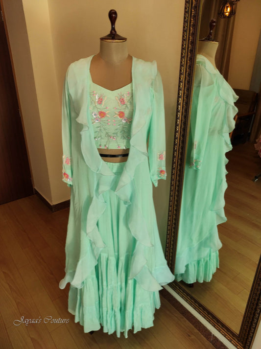 Pastel Sea green frill skirt with crop top & Jacket