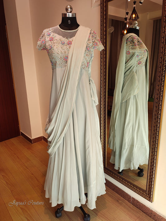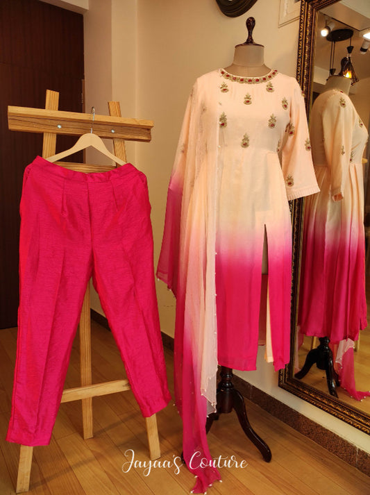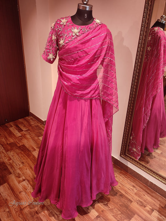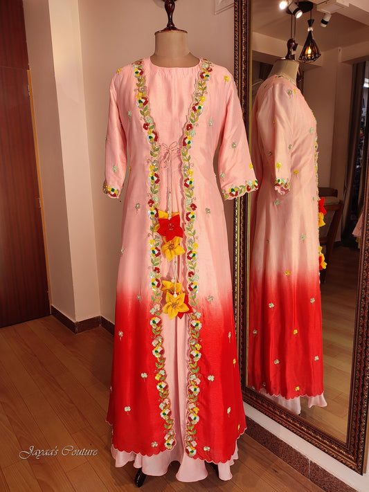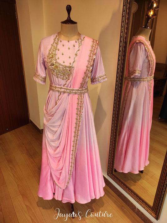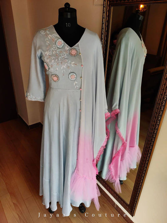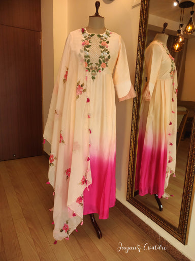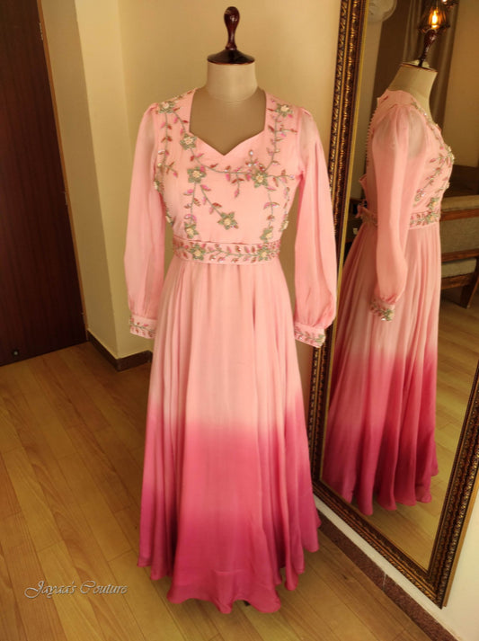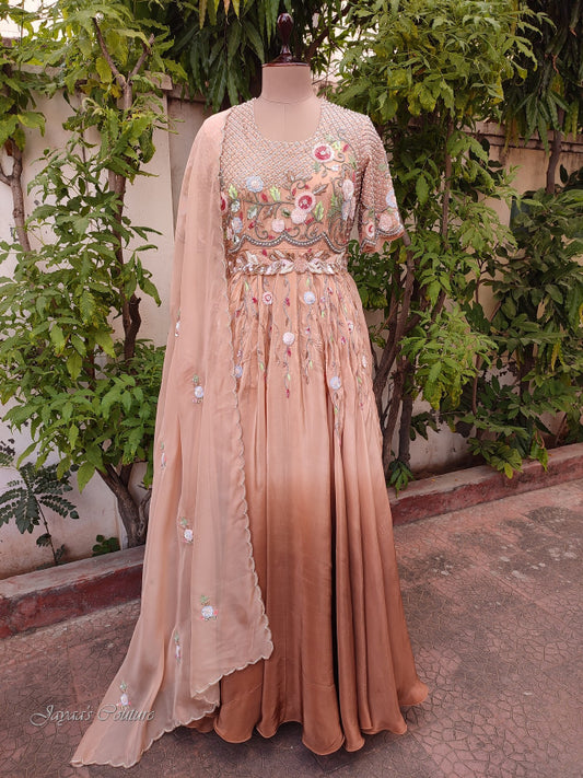 Pastel Beige To Dark Beige Ombre Gown With Belt & dupatta