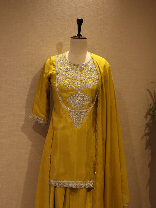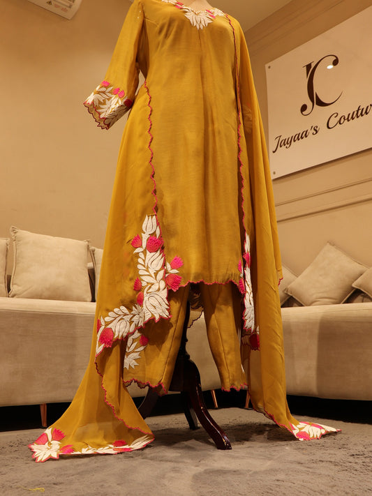 Mustard yellow applique kurta pants dupatta