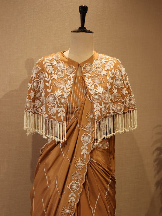 beige drape saree with cape