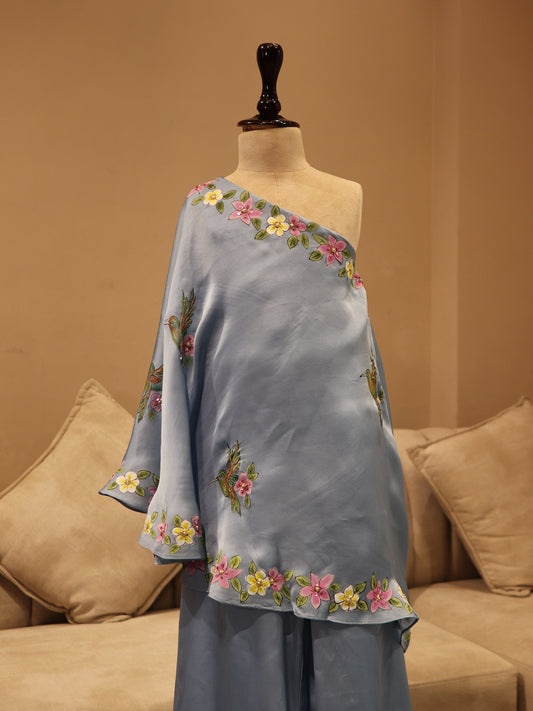 Ice blue hand painted cape top with plazo