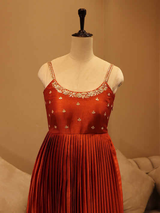 Deep rust orange pleted gown