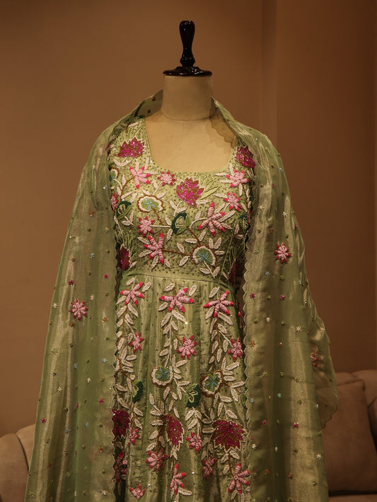 Mint green 3d flowers gown with cape dupatta