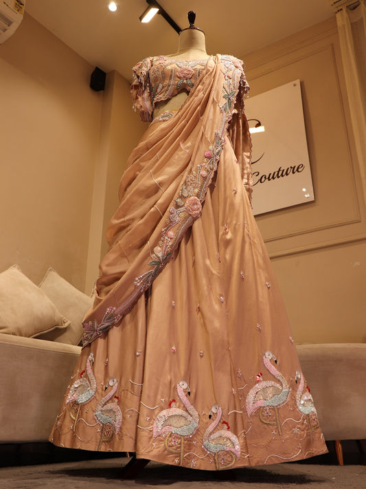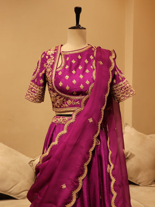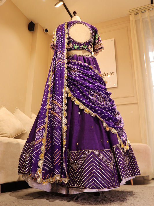 Purple hand painted Radha krishnaji bandhej lehenga set