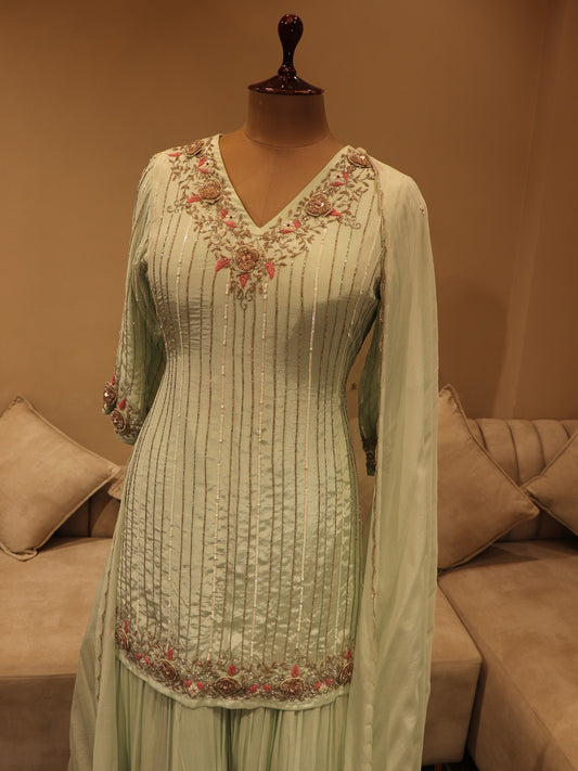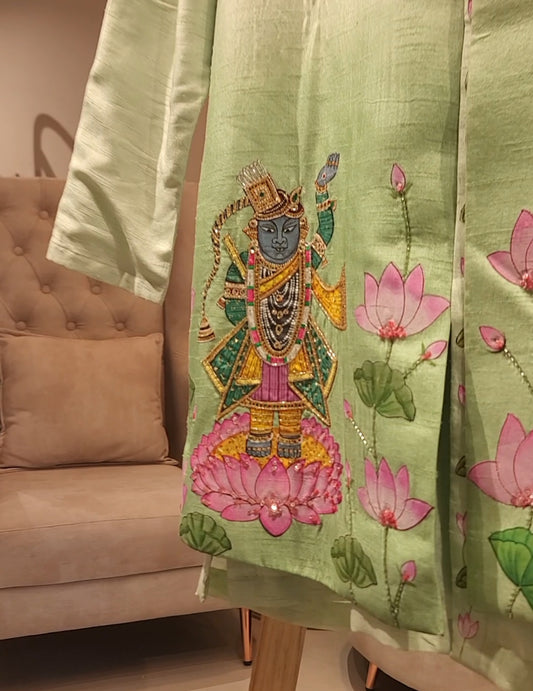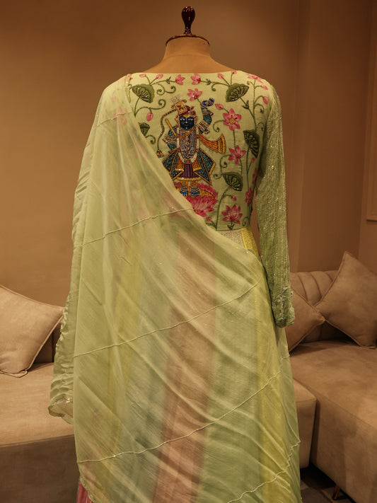 Mint green shreenathji pichwai handpainted top skirt with dupatta
