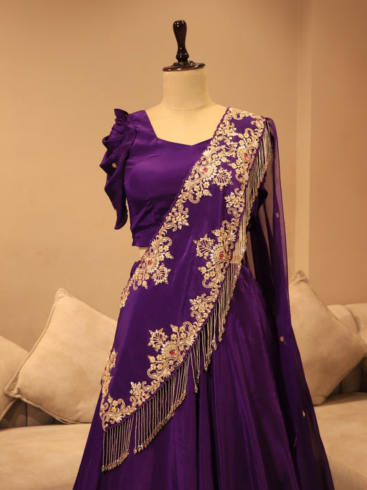 Deep purple zardosi crop top with drape skirt dupatta
