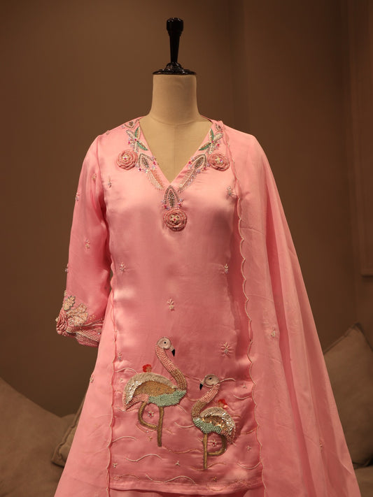 Pink crane kurta skirt with dupatta
