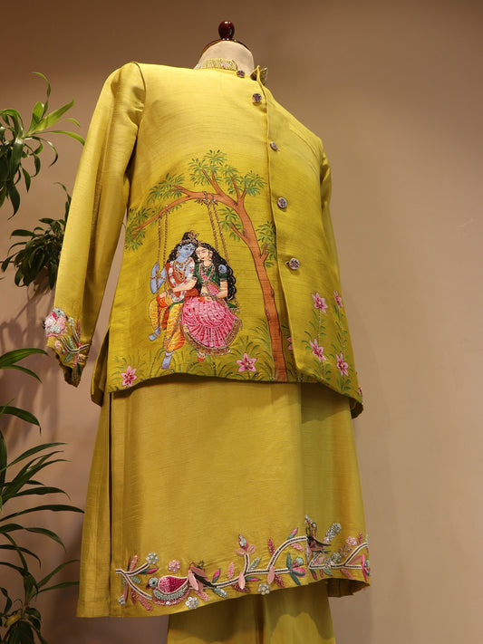 Green shaded radha krishna ji hand painted mens indo western