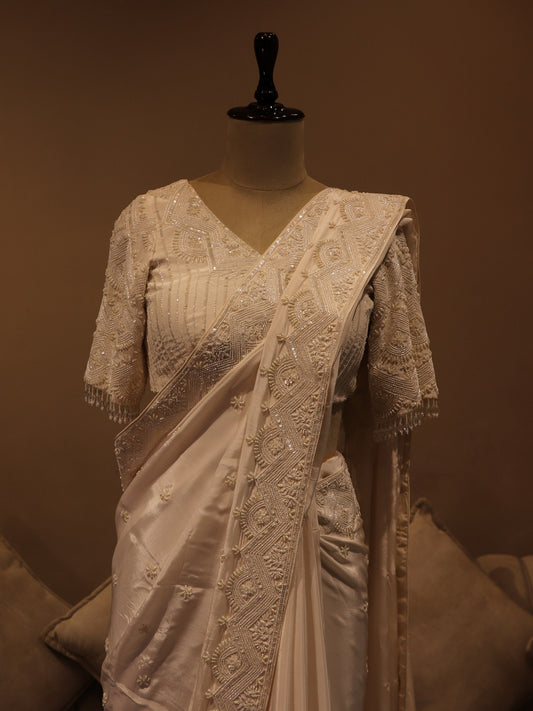 white embroidered pre drape saree