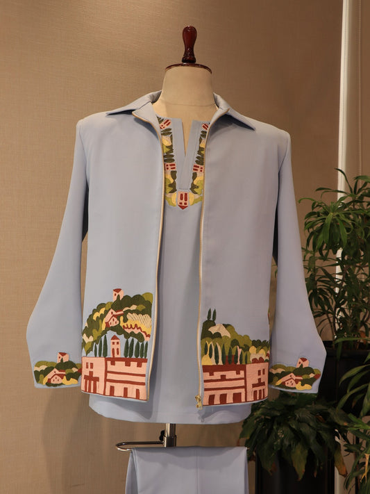 Powder blue mens embroidered bomber jacket with pants