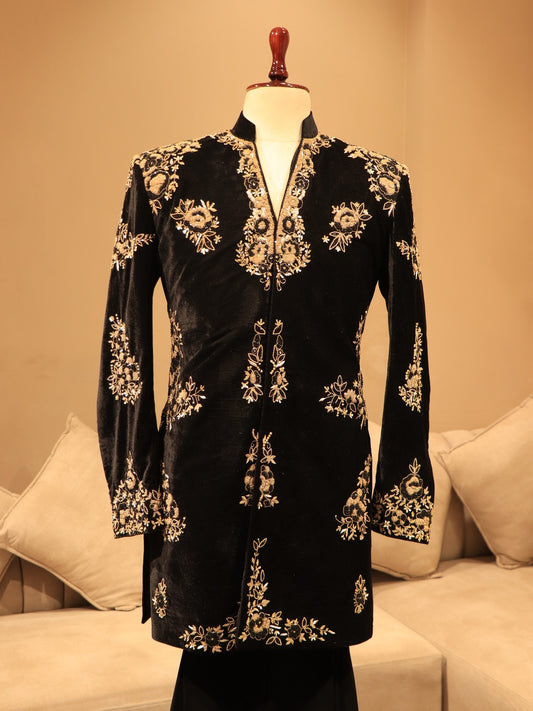 Black velvet mens achkan set