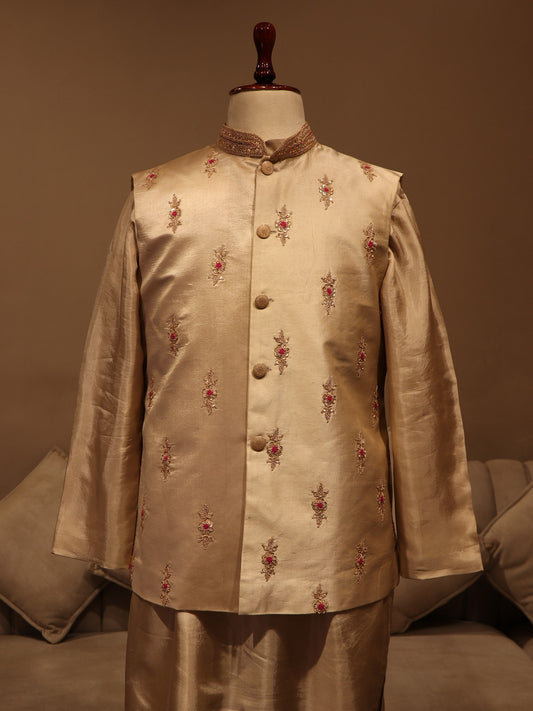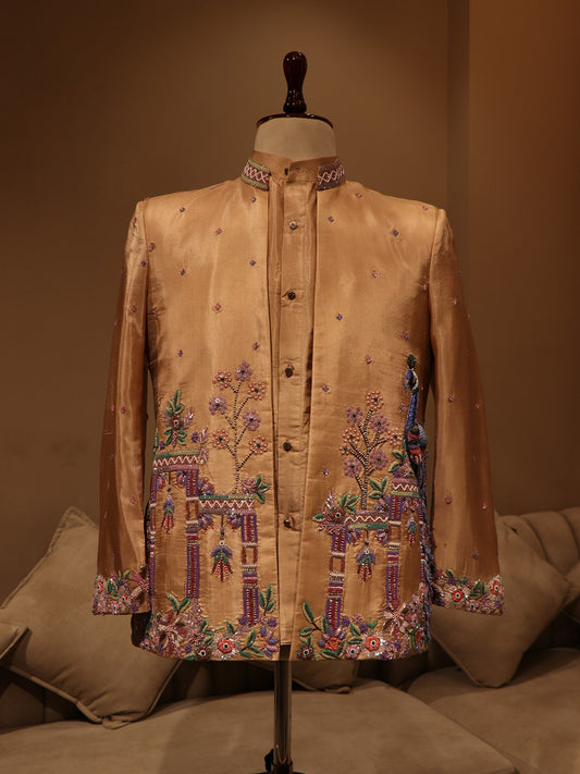 Rust orange shrinathji pichwai mens kurta jacket pants