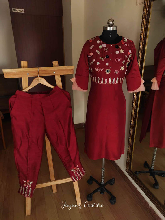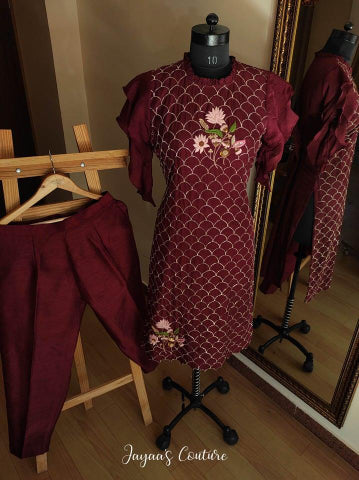 Maroon Embroidered Kurta Pants set
