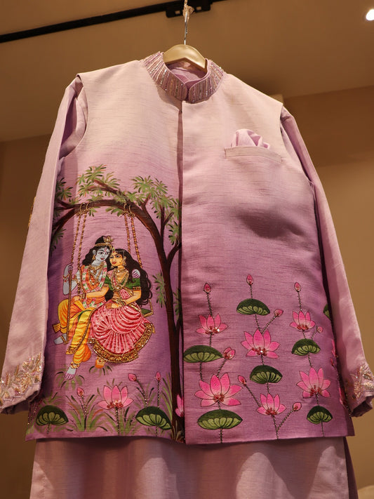 Lilac lavander shaded hand painted mens jacket kurta pants