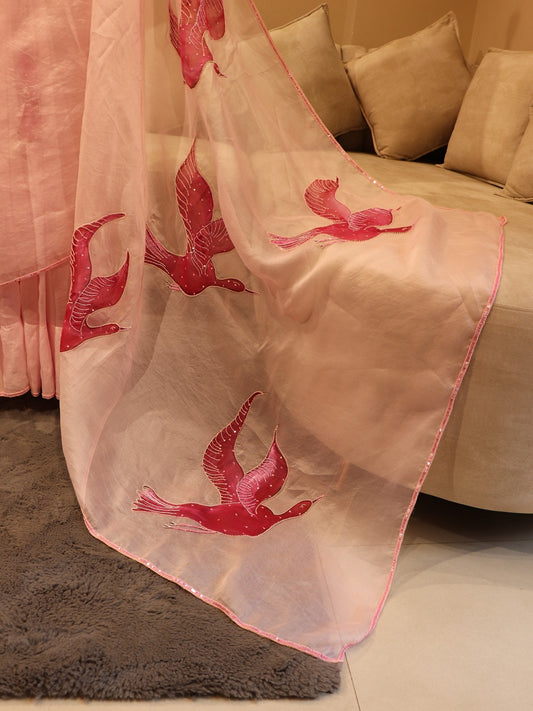 Blush pink birds Handpainted saree with blouse