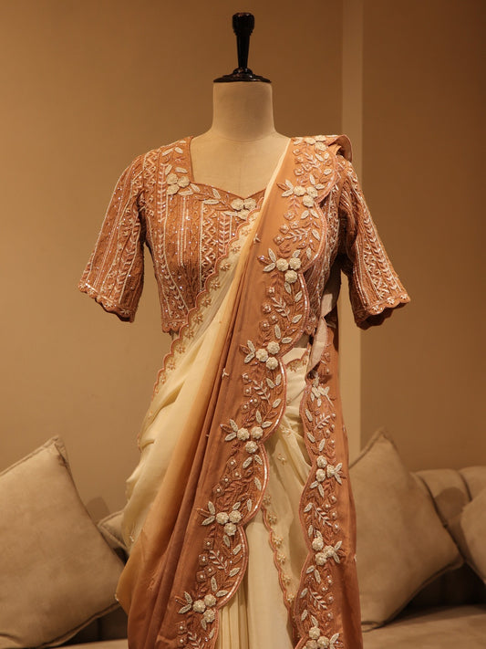 Peach white shaded pre drape saree