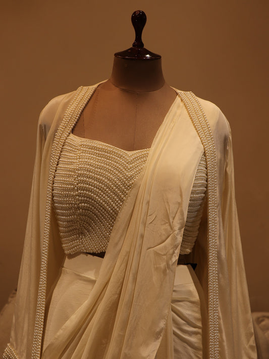 Pearl white pearls drape saree with cape