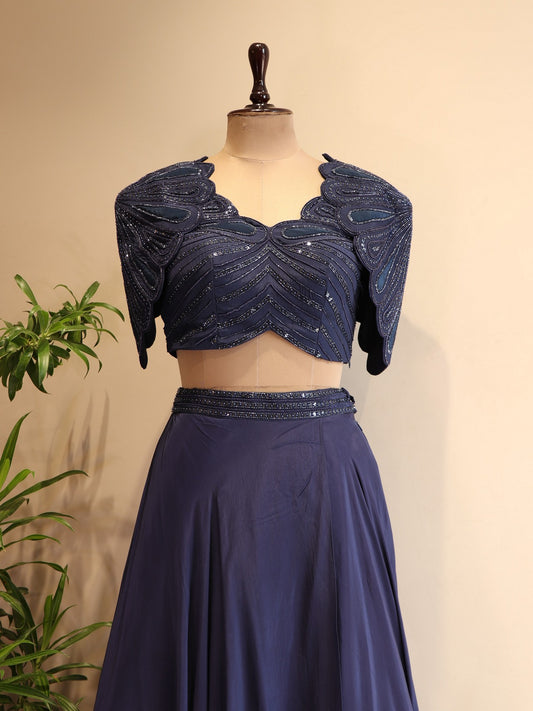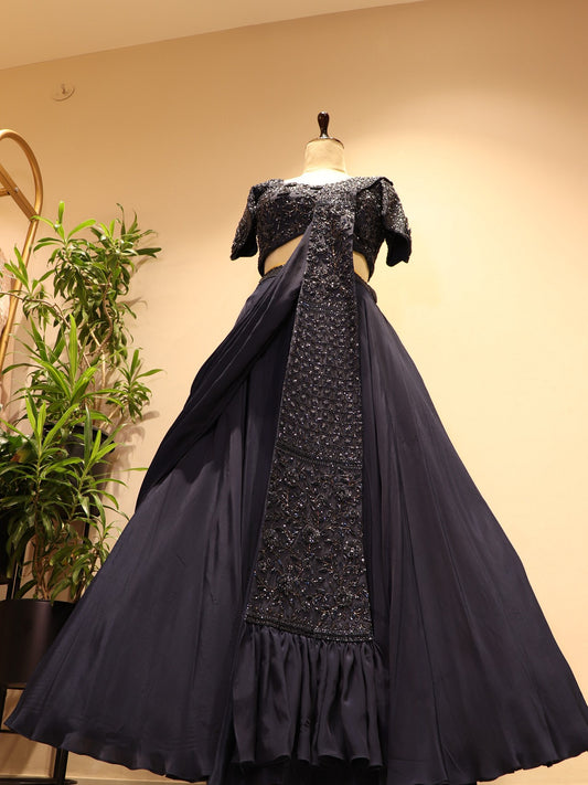 Navy blue embroidered drape lehenga set