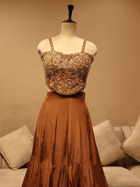 brown crop top with panel skirt