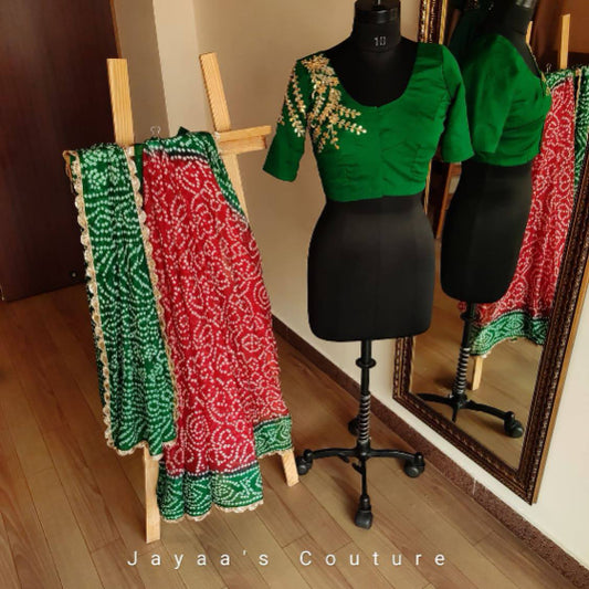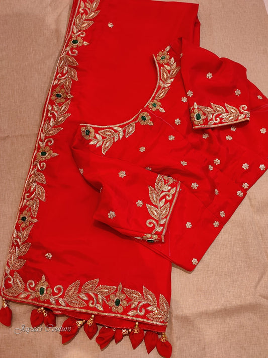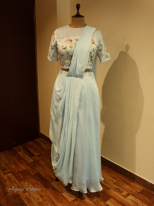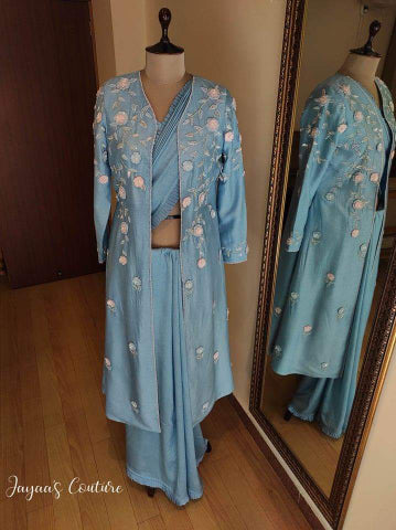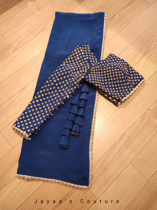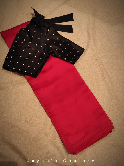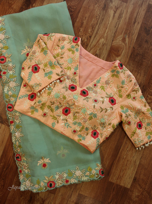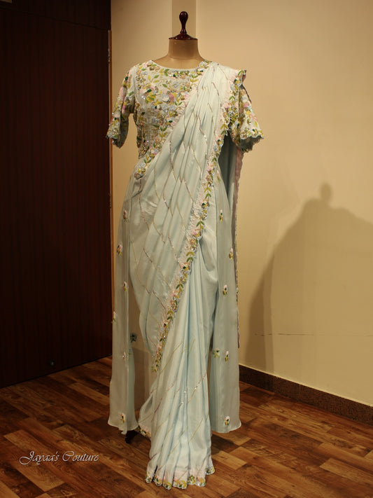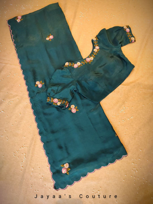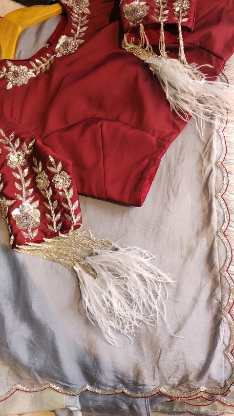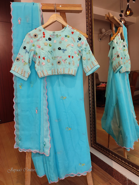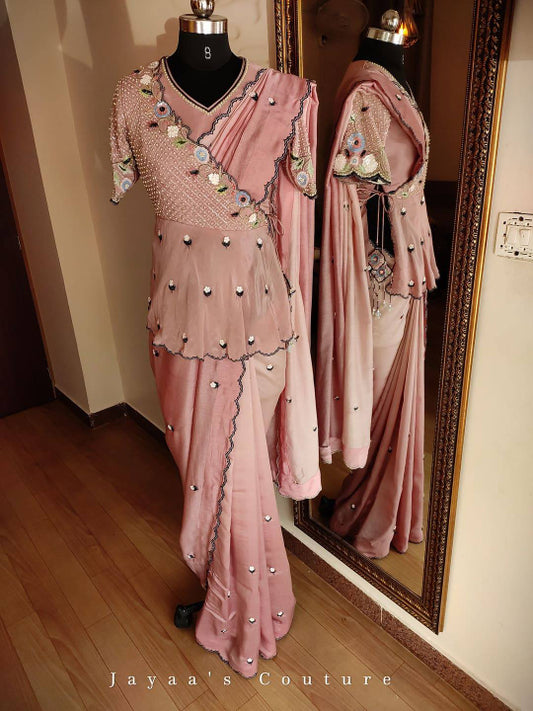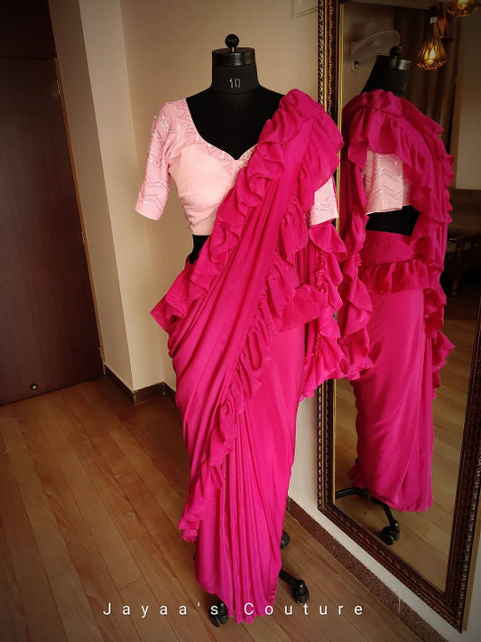 Pink Sequins Hand worked Blouse paired with Rani Georgette Saree designed with Frill.