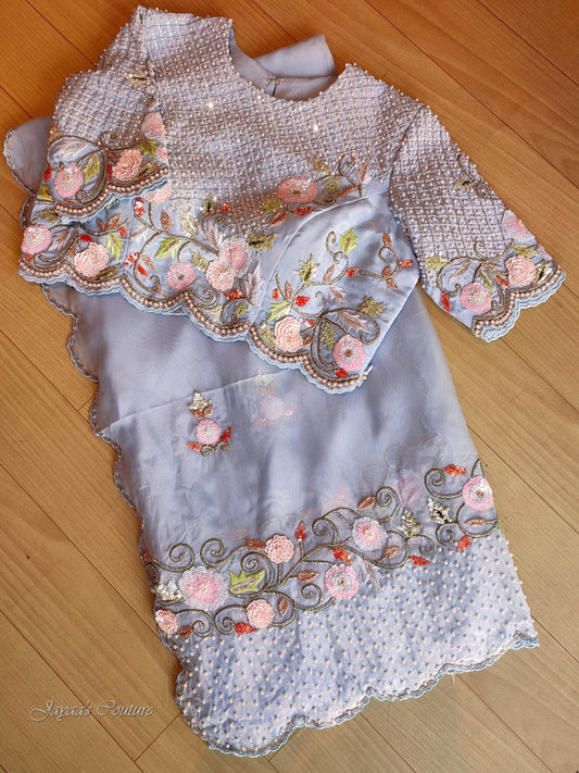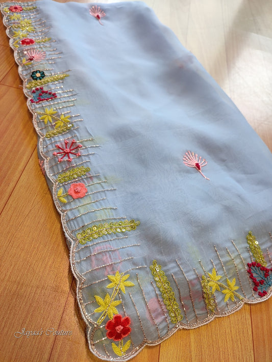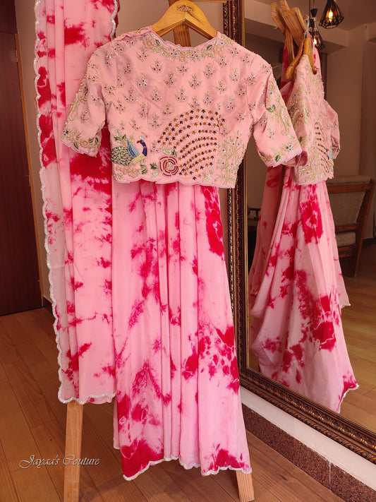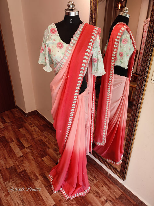 White Pink shaded Satin Georgette Saree with Rani Bandej Blouse Embellished with Handwork