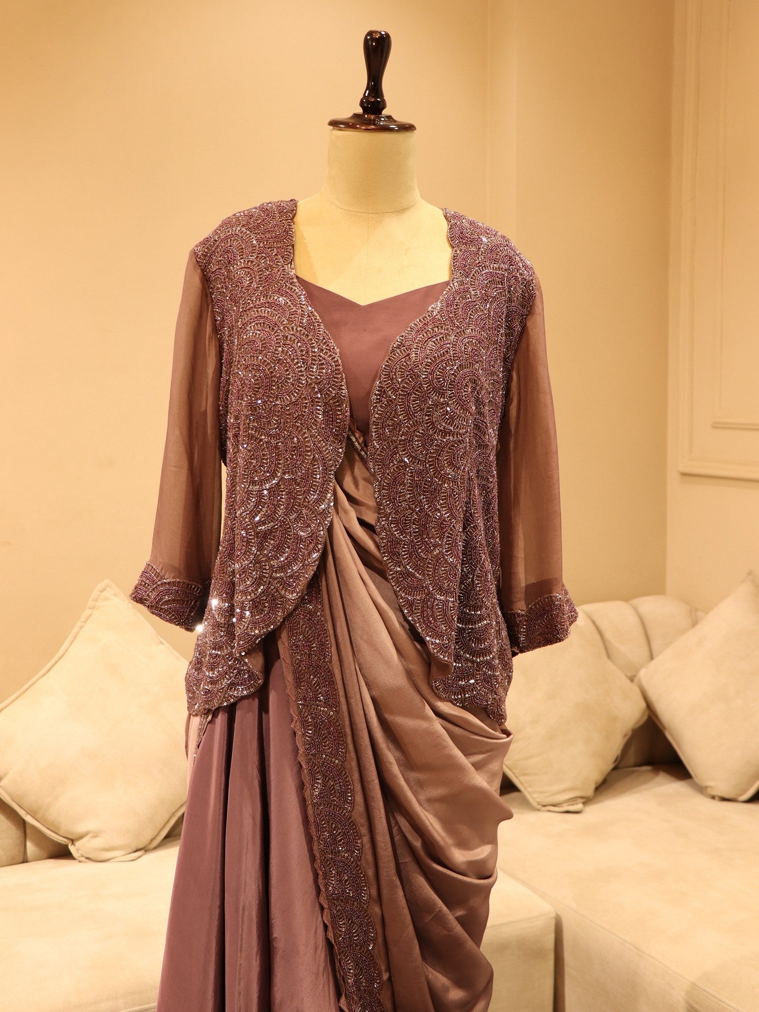 Aubergine mauve drape saree with shrug