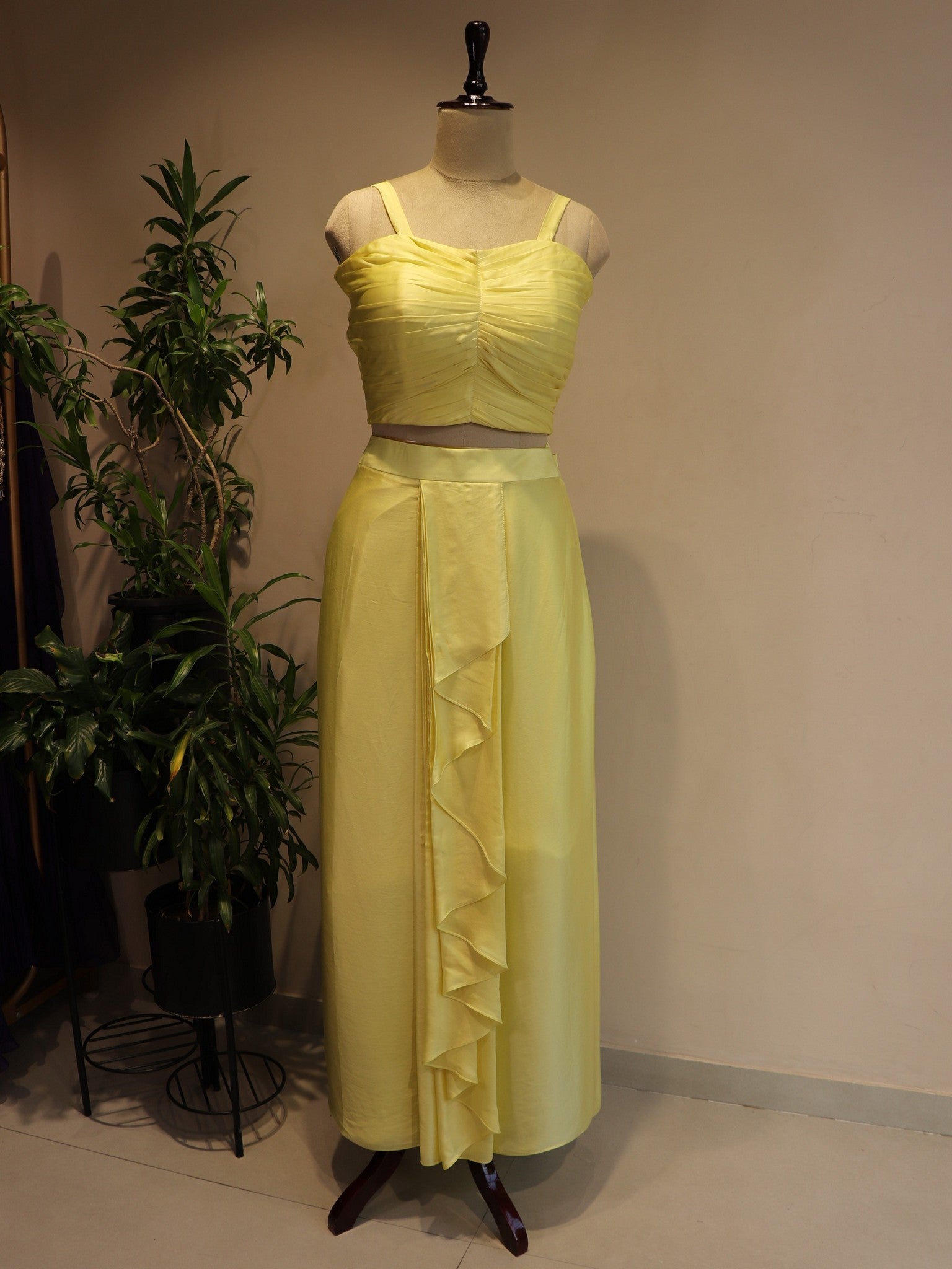 Lemon yellow cape with crop top drape skirt
