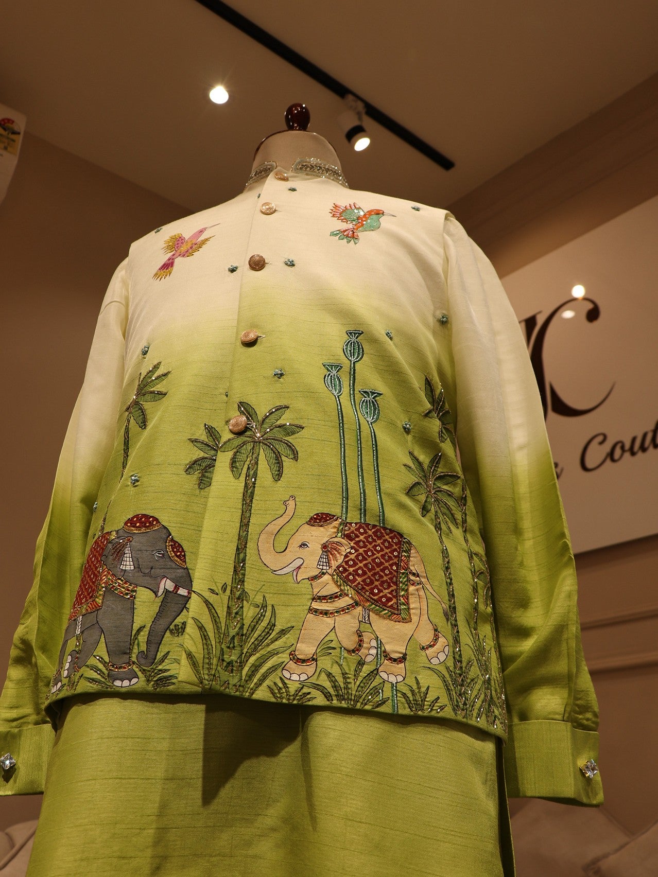green shaded elephant handpainted mens jacket kurta pants