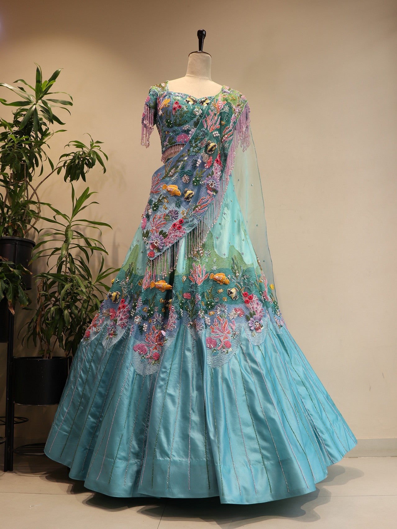 Sea green shaded aqua drape lehenga set